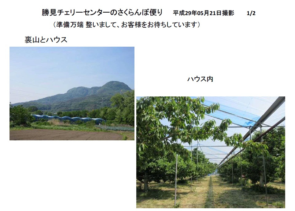 勝見チェリーセンター日記 2017/06/27 勝見チェリーセンターからのお知らせ!! 以前、お知らせしました閉園日6月30日から7月5日(水)まで5日間延長して営業を致しますので、お出掛けください。完熟をした「香夏錦・佐藤錦・紅秀峰」達がお待ちしてしています。写真は、佐藤錦:6月24日撮影勝見 豊 [2回]